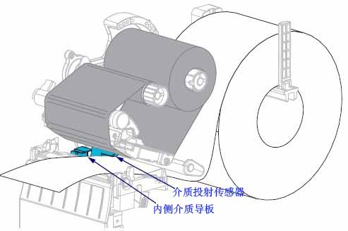 (5) Ensure the media has passed through the hole on the media projection sensor and reached below the inner media guide; the media should just touch the back of the media projection sensor slot.
